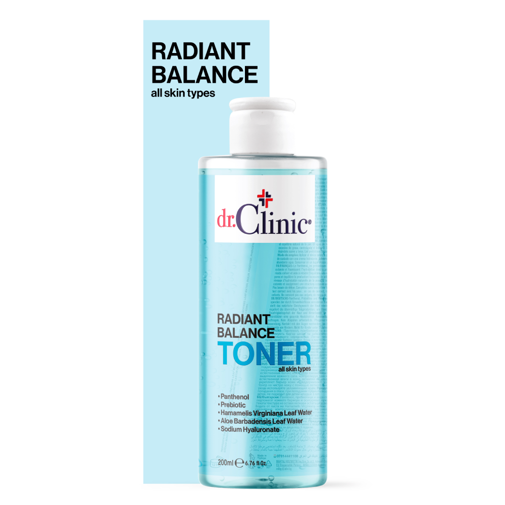 DR.CLINIC Prebiotic/ Radiant Balance Toner - Tonic (Blue) All Skin Type With Panthenol - Panthenol, Prebiotics, and Hamamelis Virginiana Leaf Water in this special formula support the skin barrier and provide the moisture that skin, tired from environmental factors, needs. Its lightweight texture leaves no sticky residue and helps restore the skin's natural balance. Hamamelis Virginiana Leaf Water gently cleanses the skin, tightens pores, and helps improve the skin's overall appearance. Sodium Hyaluronate and Aloe Vera Water increase the skin's natural moisture levels, leaving it smooth and soft. Prebiotics like Inulin and Fructose contribute to maintaining the skin barrier and hydration. Radiant Balance toner for all skin types is designed for gentle care, effectively cleansing, hydrating, and soothing the skin. Inulin and Saccharide Isomerate strengthen the skin barrier and provide long-lasting hydration, giving the skin softness and comfort throughout the day. Its light fragrance provides a refreshing and pleasant restorative feeling, making it ideal for daily use.